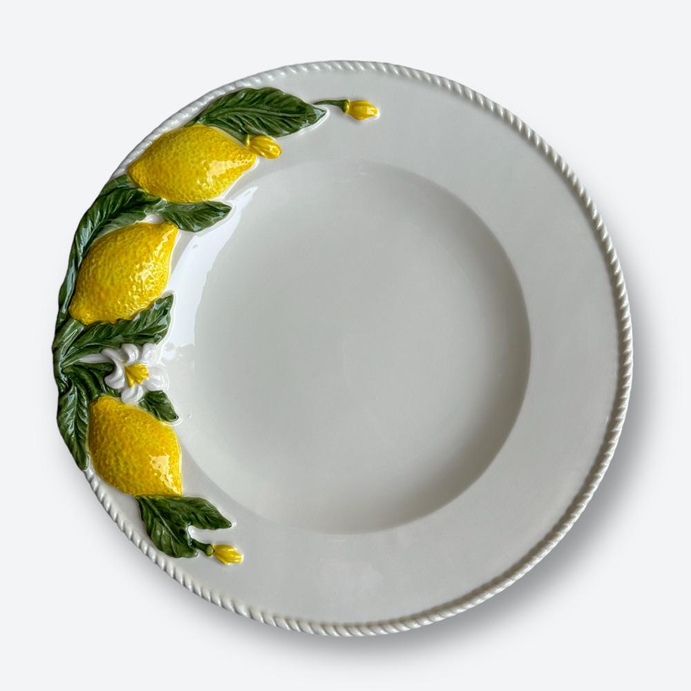 استمتع بقطعة فنية فريدة من نوعها مع هذا الصحن الدائري الإيطالي الفاخر المصنوع يدويًا. يأتي هذا الصحن بتصميم دائري أنيق بقطر 28 سم، ويتميز بجهة واحدة بنقوش بارزة تصور الليمون وأوراقه.